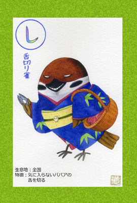 "Shitakiri-suzume" Habitat:Villages Character:The sparrow that cuts bad granny's tongue. |