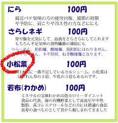 | スーパー野菜『小松菜』は骨粗しょう症予防のエース 小松菜は常食野菜の中で、最も多くカルシュウムを含む食品です。 ほうれん草と形が似ていますがカルシュウムは、ほうれん草のなんと5倍もあり、ちなみに、牛乳と比べても3倍のカルシューム量なのです。 瀬佐味亭が小松菜にこだわる理由はここにあるのです。 さらに言わせて頂くとほうれん草には、シュウ酸と言う物質が含まれるために、茹で時間を長くかけて、シュウ酸を除去する必要があります。このために熱に弱いビタミンCはほとんど壊れてしまうのです。 小松菜にはこれが無いため、茹で時間も短時間で済むので、ビタミンCがより多く残ります。 瀬佐味亭ではサラダ感覚のように、大量のお湯を使って、ほんの5〜6秒の茹で時間で仕上げて栄養素を失わない、と同時にパリパリの歯ざわり感を大切にしています。 こればかりはご家庭では難しいかと思われます。 今、ガン予防で注目されている、ベータカロチン、ビタミンA効果も100g中1800IUと、成人女性の一日必要量を満たすほど。さらにビタミンC、E もバランス良く大量に含み、まさにスーパー野菜なのです。育ち盛りのお子様や女性に、特にお勧めしたい野菜ですね。 当店ではトッピングとしてもメニューにのせておりますので是非一度お召し上がり下さい ![]() 小松菜は、冬場に採れるので、かつては冬菜、雪菜、正月の雑煮に欠かせないので正月菜などと呼ばれていました。東京・江戸川の小松川地区でたくさん作られていたため、「小松菜」と名前がついたようです。 |