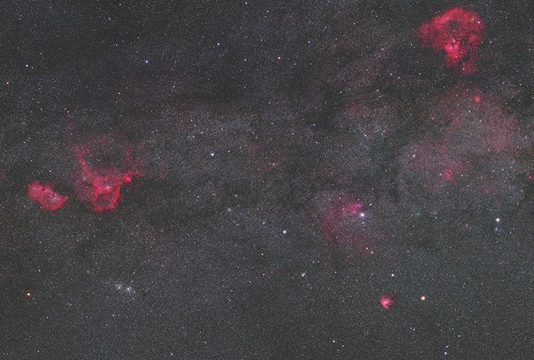 高温化で夏の天気が安定していない中で8月に天体撮影の機会に恵まれたのはラッキーでした。 このあたりにはいろいろな星雲がありますが、かなり輝度差があります。カシオペアのW字の真ん中にあたる γ星付近にあるIC59・IC63から淡く伸びる星雲は暗めなのですが、そこに合わせる処理をすると 輝度が高く写りやすいIC1805・IC1848はべたっと潰れた感じになってしまうので、部分的に調整しています。 |